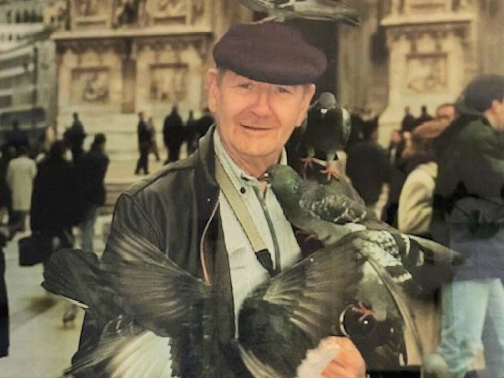 其他几年品是一张照片,愉快的涟漪从他的脸上辐射出去,当一群鸽子落在他的肩膀和手臂上的时候,这是在去罗马的时候拍的。抓住了他生命中快乐的片段,可以一撇他的内心和灵魂——他究竟是什么样的人。他是暴躁粗鲁的人,却给本地动物庇护所了慷慨的支持,那个直接务实的乖戾老头,他给ups司机了实质的财务帮助,他忠诚的在当地五福了很多年,当鲍勃发现他生活艰难的时候,他是他们沉默的赞助人。