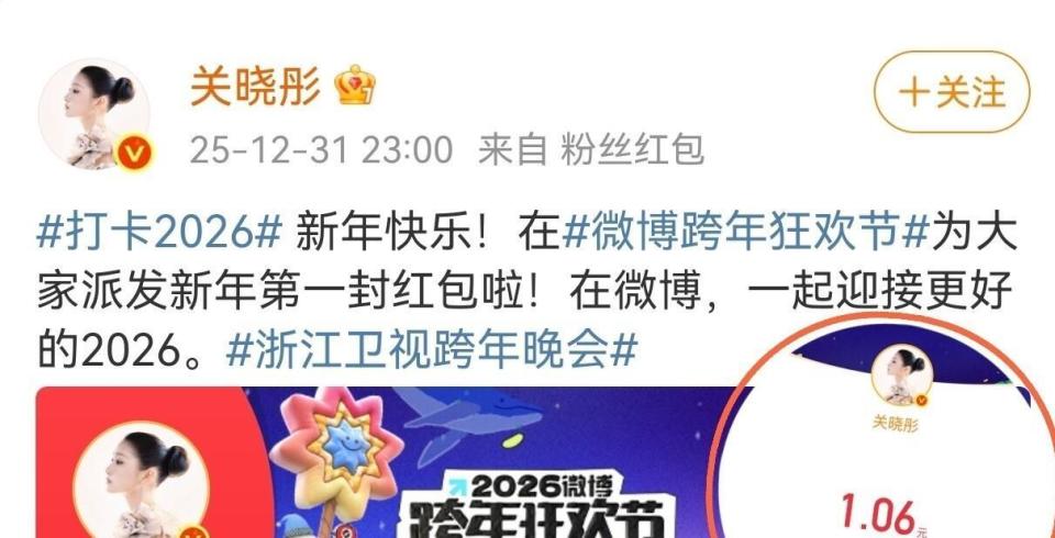 关晓彤的跨年夜从12月31日17:24开始,她在社交平台晒出央视跨年晚会造型。 双高马尾搭配粉色围巾和白色棉服,青春洋溢的形象完全看不出她已28岁。 五小时后,22:32,关晓彤再次更新动态,这次是她在浙江卫视晚会直播演唱《打火机》的视频。 半扎高马尾、套装皮衣棕色短裙搭配浅棕色长筒靴,风格从甜美转向酷飒。 当晚23:00,关晓彤的账号自动发布了给粉丝发放红包的动态。