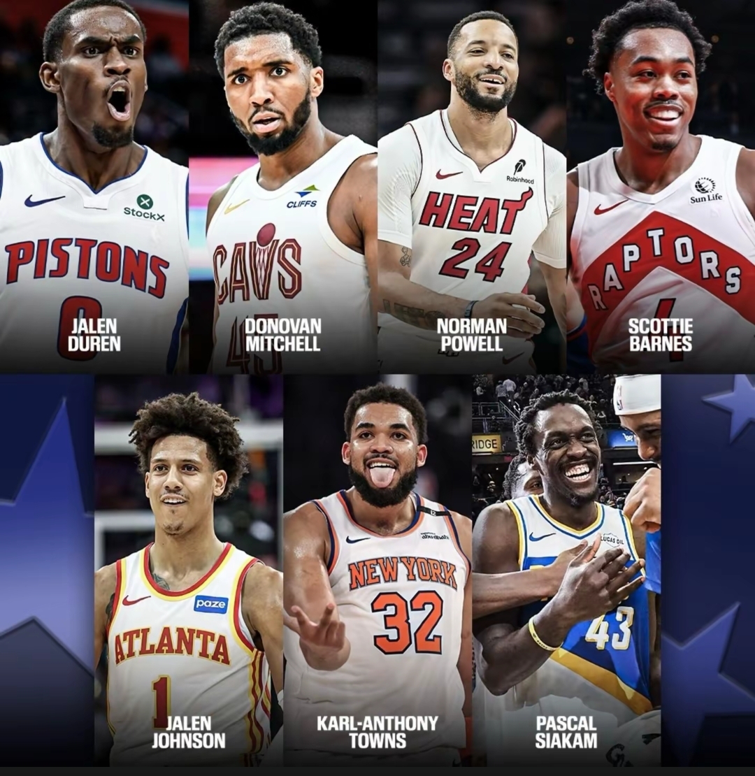 东部阵容:首发五虎:马克西、字母哥、凯德·坎宁安、杰伦·布朗、布伦森。