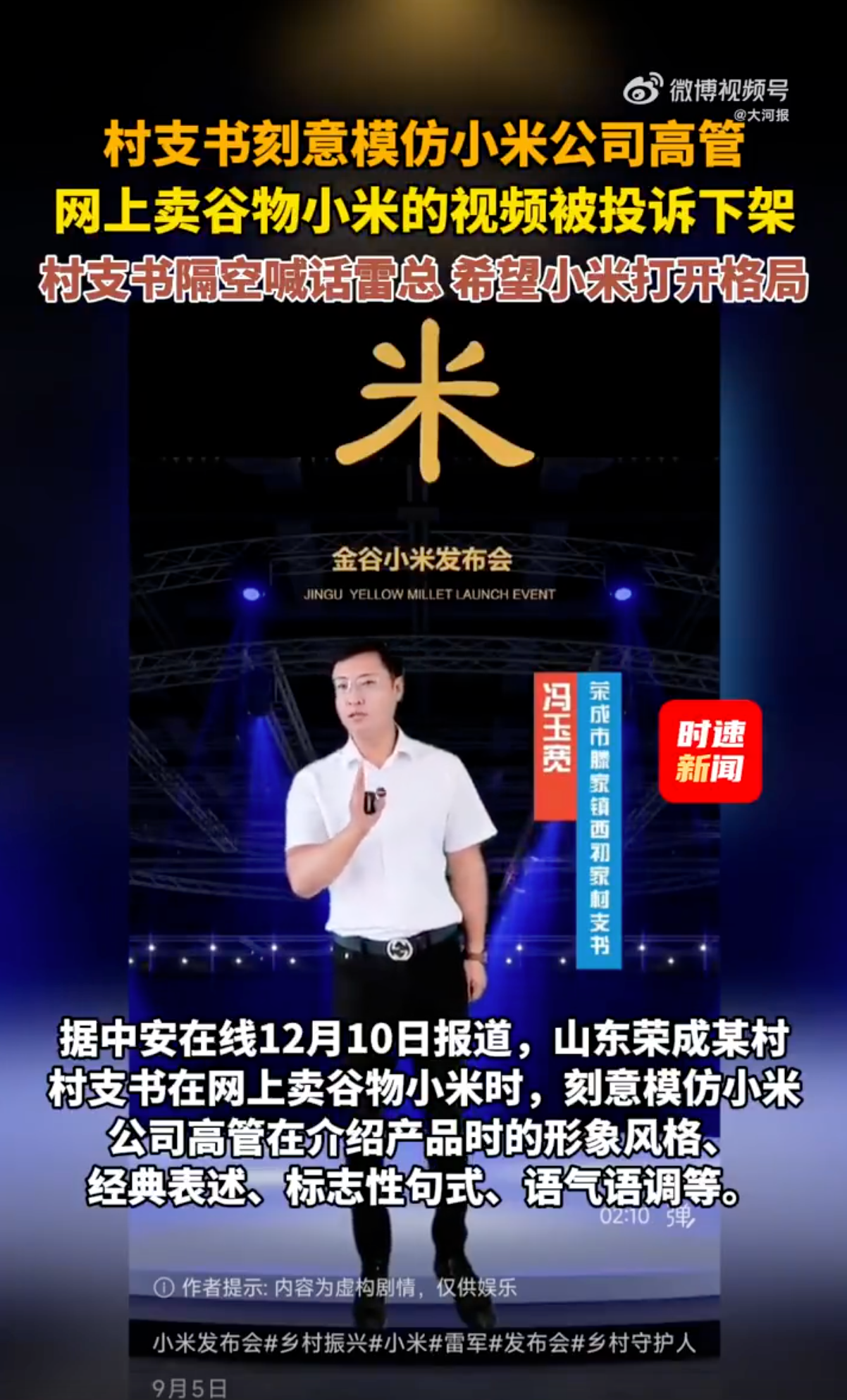 近日,山东威海西初家村村支书冯玉宽因网上售卖谷物小米,其相关推广视频遭小米公司法务投诉下架,引发舆论关注。