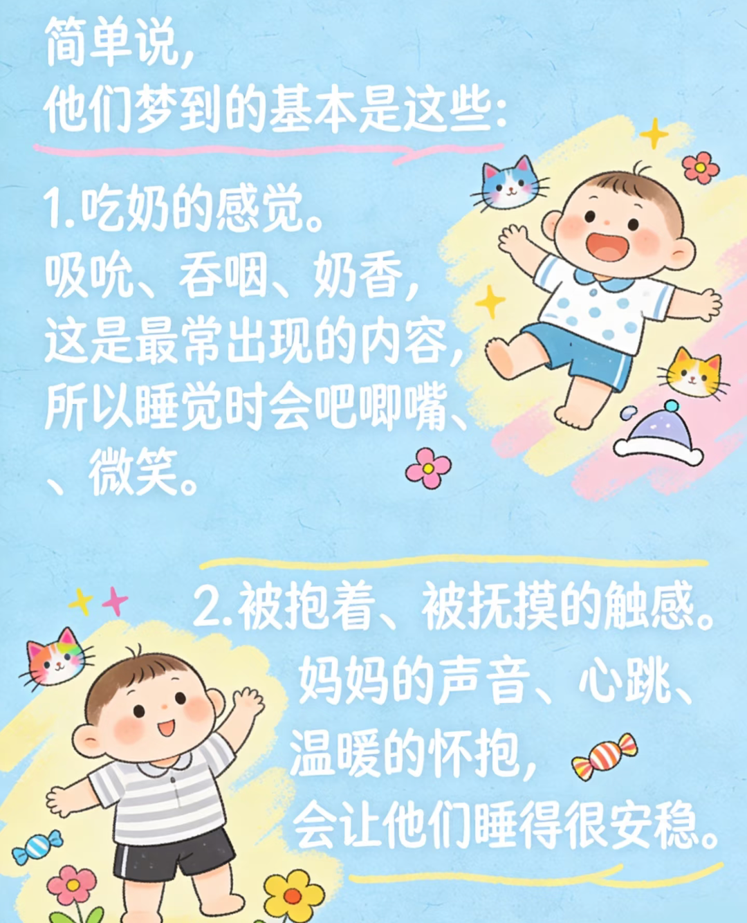 只是,宝宝究竟梦见了些什么呢?这个问题没有人能给出确切的答案,因为他们还不会用语言来描述那些在睡梦中一闪而过的画面。但我们可以温柔地猜测,那些梦境里不会有复杂的故事情节,也不会出现白天听过的童话角色。小婴儿的梦,大概更像是被揉碎了的感官记忆——妈妈怀抱里那股熟悉的奶香,乳房柔软的温度,奶瓶递到嘴边时的期待,还有被一双大手稳稳托住后背时的安心感。这些触觉、嗅觉和味觉交织在一起,构成了他们梦境中最原始也最温暖的底色。