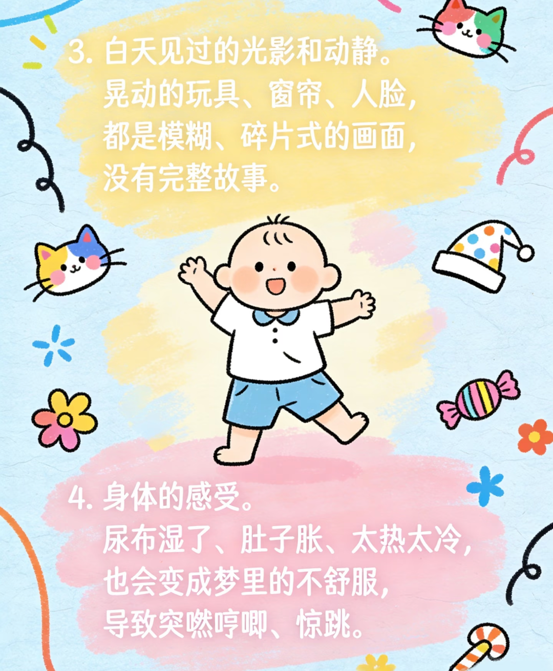 不过说到这里,很多妈妈都会开始担心一个问题:如果宝宝在梦里哭闹了,要不要马上把他叫醒呢?其实不用太着急。绝大多数情况下,梦境只是大脑在整理白天接收到的信息,宝宝在梦里哭两声或者动几下,很快又会自己沉沉睡去。真正需要我们温柔介入的,是当他哭得越来越厉害,明显陷入惊恐无法自行安抚的时候。这时你可以轻轻把手放在他的背上,用你熟悉的声音说一句“妈妈在呢”,让他从梦境里感受到现实世界中最坚实的安全感。但尽量不要大力摇晃或者大声喊醒他,那样反而会让他醒来后更加困惑和害怕。