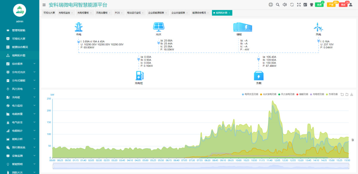 优化调度:根据分布式能源发电预测、负荷预测结果,并结合分时电价、电网交互功率及储能约束条件等因素,以用电成本低为目标,建立优化模型,采用深度学习算法解析微电网运行功率计划,系统通过将功率计划进行分解,实现对光伏、储能、充电桩的优化控制。
