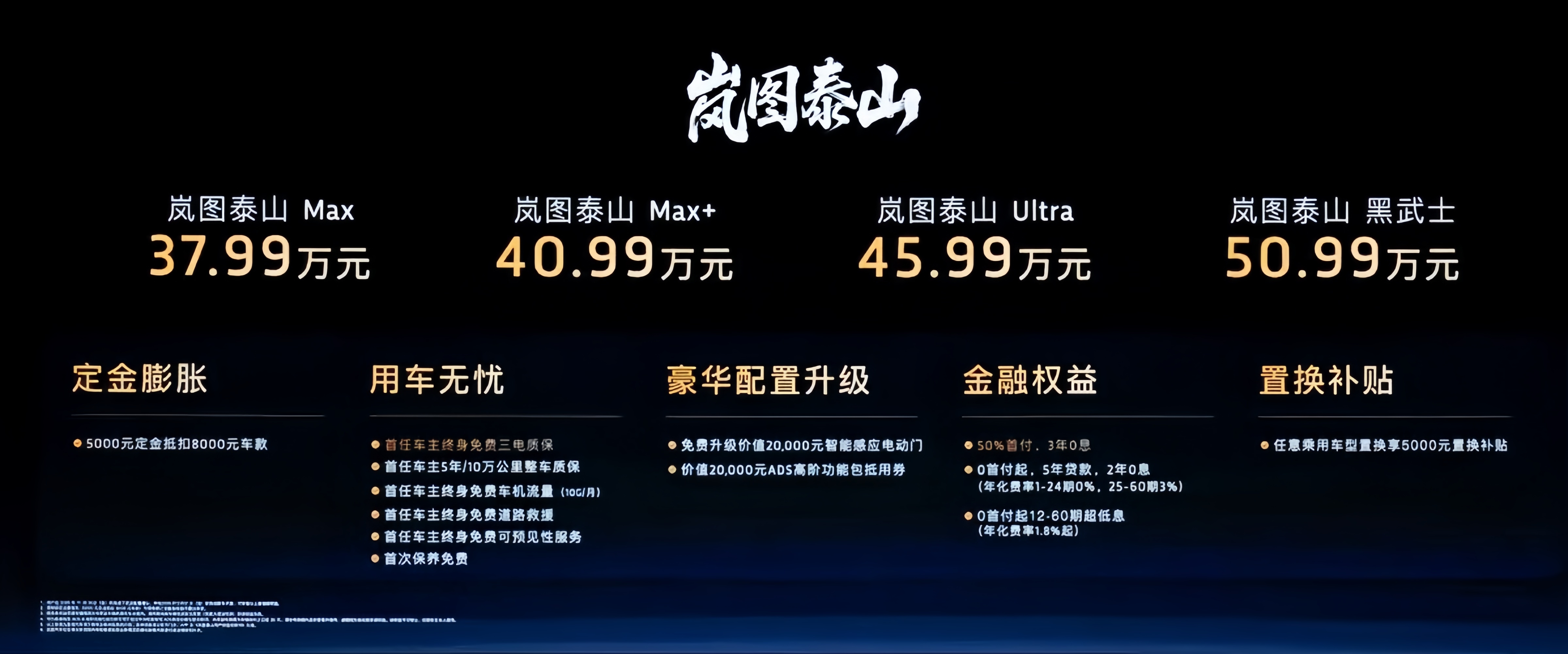 11月22日,岚图新时代全尺寸旗舰SUV——岚图泰山正式登陆南昌,新车共推出Max版、Max+版、Ultra版、黑武士版四个版型,官方指导价格为37.99万元~50.99万元,并同步公布了价值48,000元的首销期限时权益。