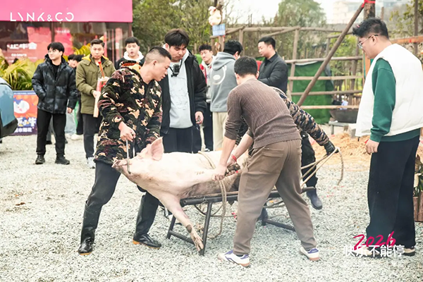 最受期待的杀年猪环节,将现场氛围推向第一个高潮。这道刻在中国人记忆里的腊月仪式,以最质朴的方式唤醒了大家对年味的向往。湖南亚马逊为车主们备好丰厚的“年味大礼包”,新鲜现采的蔬菜、刚分割好的新鲜猪肉被分装成份,工作人员有序地为每位车主分发年货,沉甸甸的礼包里,既有舌尖上的美味,更有领克对车主的真挚关怀。