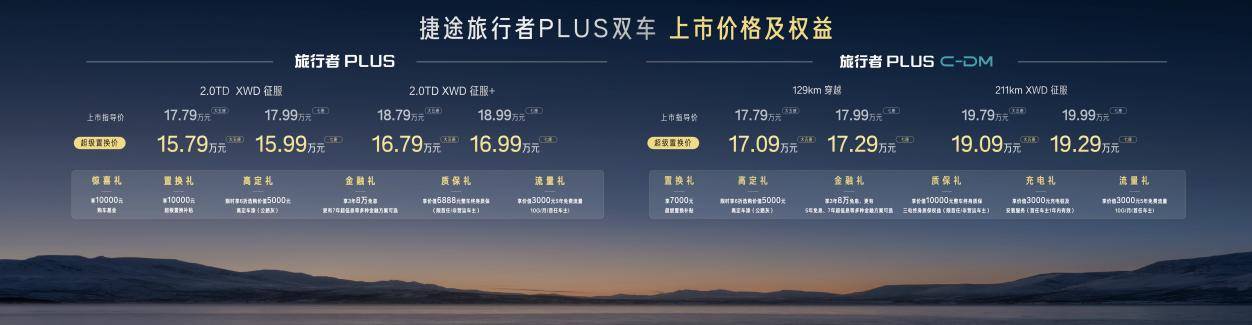 本次上市的捷途旅行者PLUS系列,覆盖“燃油+电混”双动力布局。捷途旅行者PLUS提供2.0TD XWD征服、2.0TD XWD征服+两款配置,官方指导价为17.79万元-18.99万元,超级置换价15.79万元-16.99万元。捷途旅行者PLUS C-DM则推出129km穿越、211km XWD征服两款配置,官方指导价为17.79万元-19.99万元,超级置换价17.09万元-19.29万元。