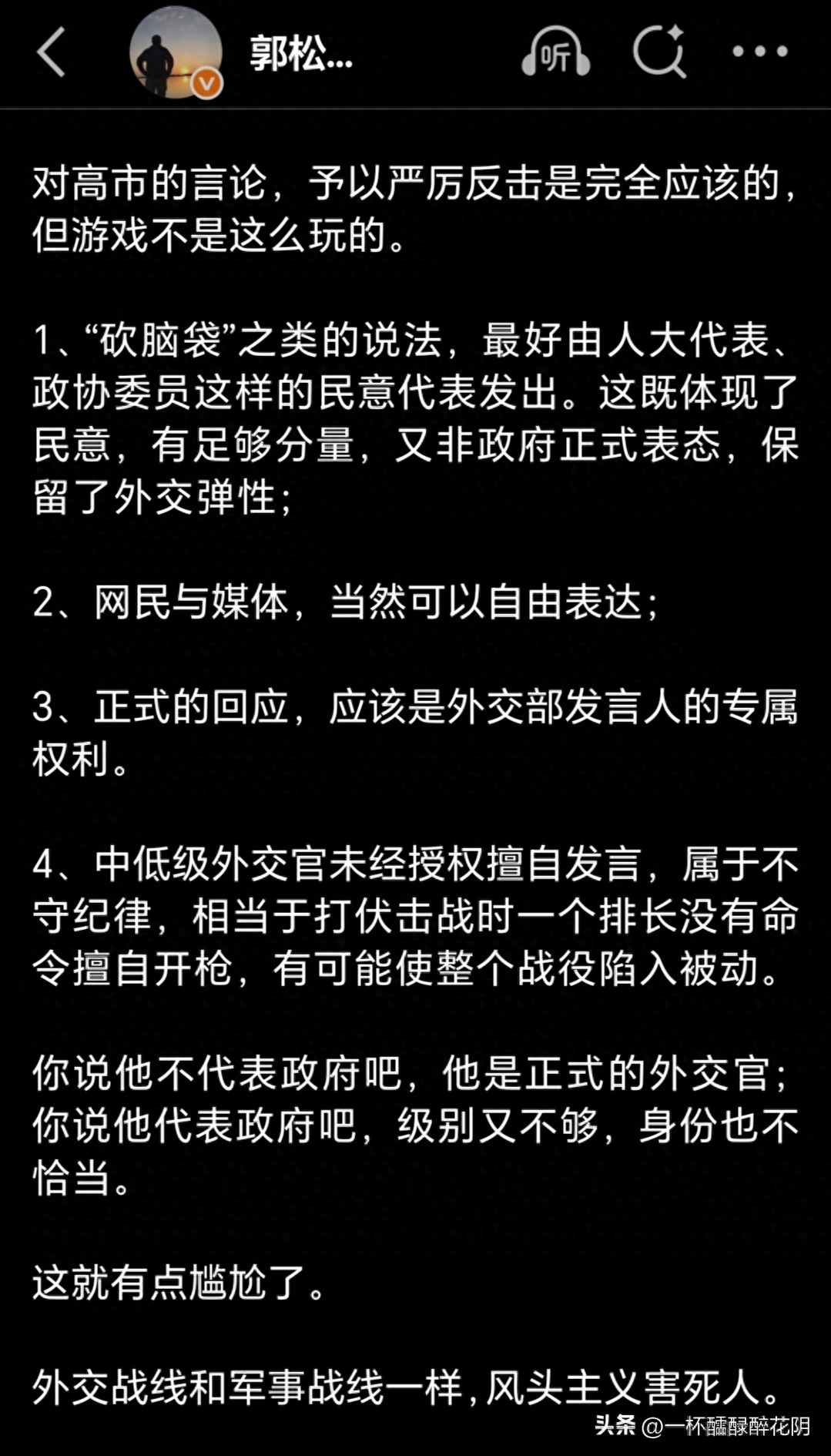 在“网民与媒体,当然可以自由表达”的表述背后,藏着郭松民赤裸裸的双重标准。他默许网民、媒体的发声权利,却暗中将外交官的同类反击污名为“越界”,实则割裂了外交回应的整体性与协同性。