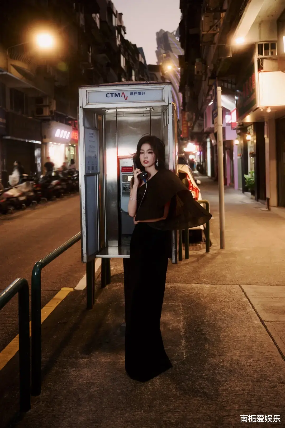 这身造型出自黎巴嫩顶级高定设计师Rami Al Ali 2025秋冬系列,黑色斜肩设计勾勒出优雅锁骨线条,高开叉裙摆若隐若现地展露腿部曲线,搭配De Beers紫钻与蓝钻高级珠宝,冷冽光芒在夜色中流转生辉。拍摄团队别出心裁地将取景地设在澳门街头,暖红与冷蓝交错的霓虹灯牌映照在她复古波浪卷发上,胶片质感滤镜加持下,每一帧都宛如90年代港风电影截图。