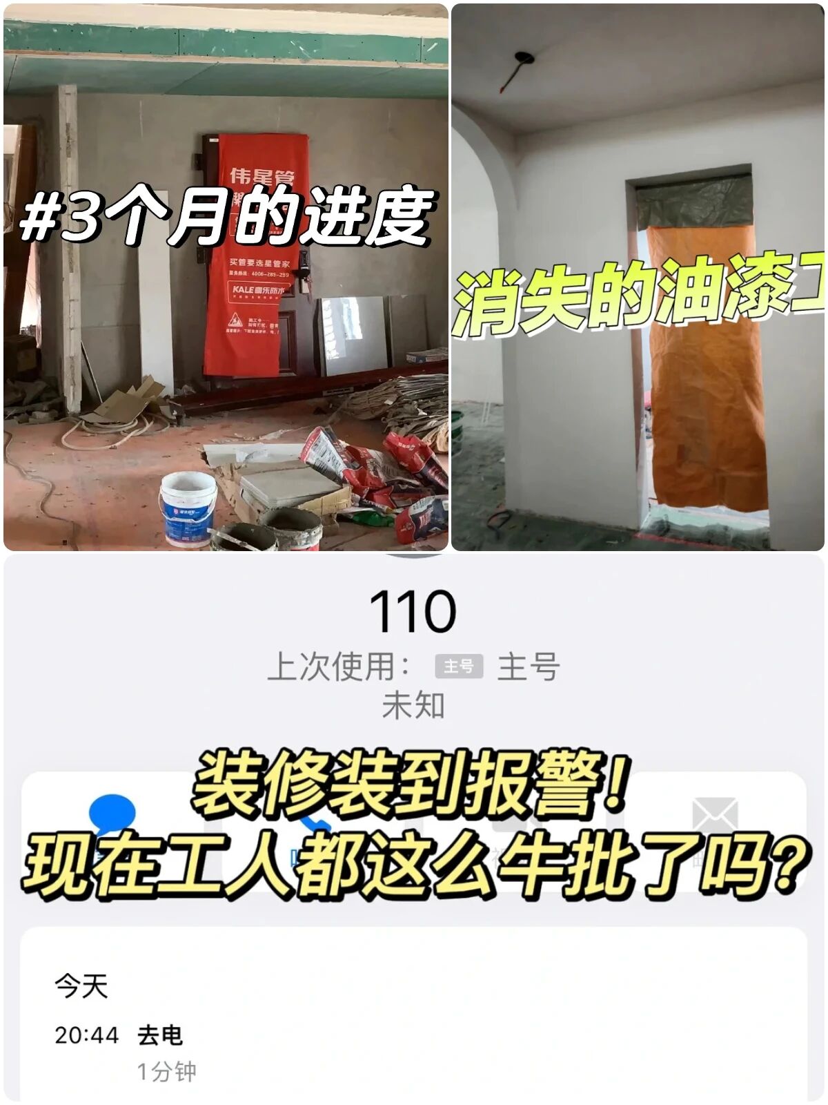 ▲很多工人是当初承诺的“加急”,都是嘴炮,最后拖延摆烂,十天半个月不带来干活的,最后还要体谅他们忙,嘴上说得天花乱坠,实际行动一动不动,真的越想越气。写在最后:奉劝各位,装修工人千万不能找年纪大的(超过50岁),越年轻越好;年纪大的师傅思想落后,手艺工具差,教条主义,电话永远打不通,还会站在道德制高点批判你,最后你还得乖乖付钱并原谅他。