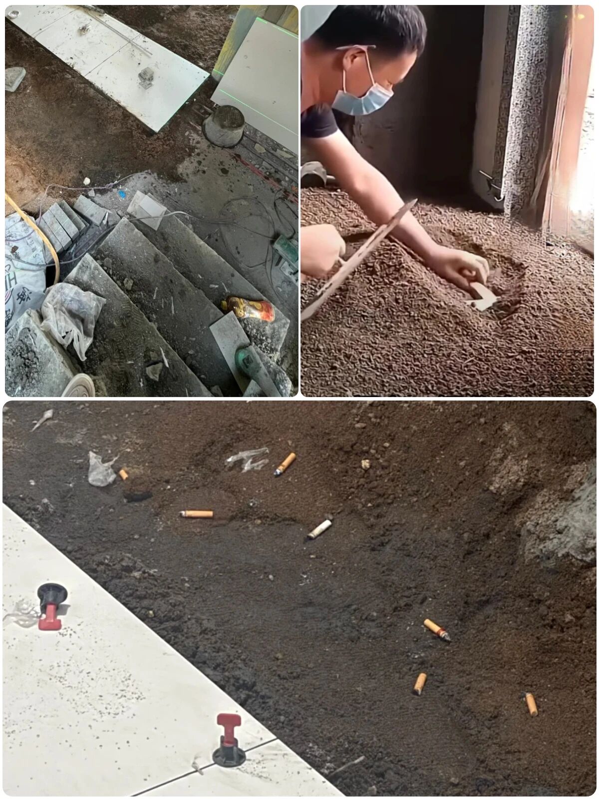 ▲贴砖前地面不清理,全是垃圾,钉子烟头直接盖在水泥砂浆中,有责任心的能有多少?问就是贴砖贴到哪,就扫到哪?这不去监督能行?腻子加胶/油漆猛加水