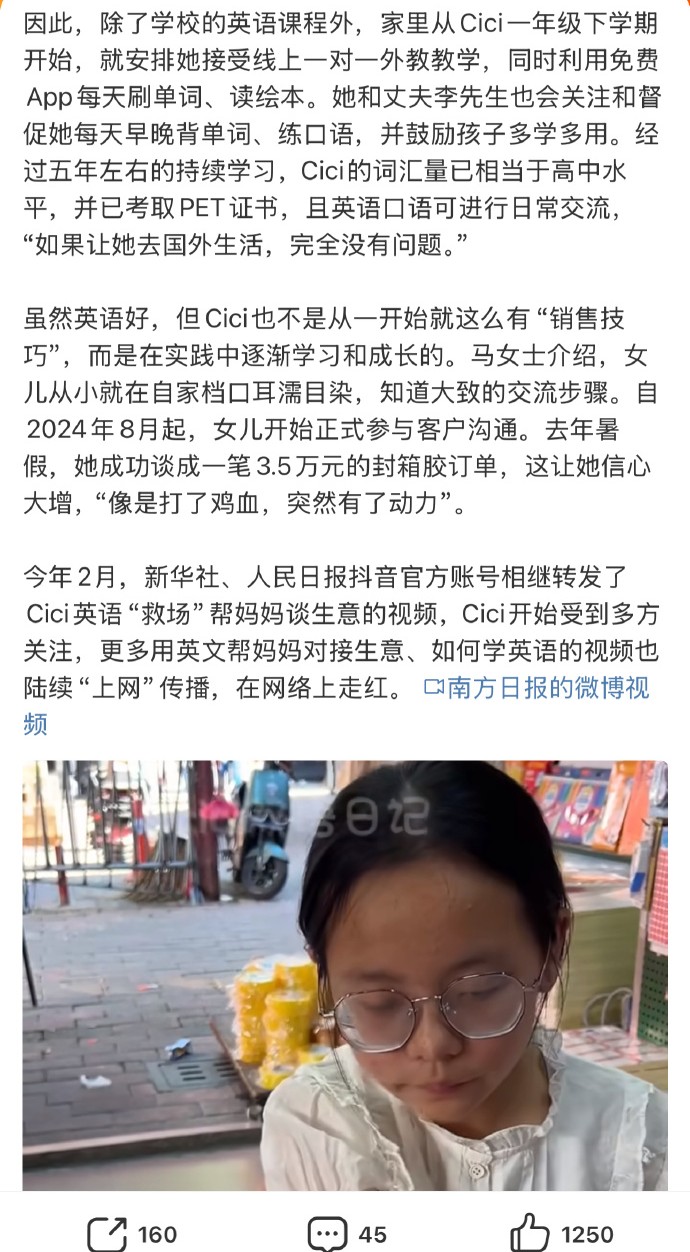 当很多孩子还在为英语考试发愁时,Cici已经将语言转化为创造价值的工具。她的成功引发我们思考:什么才是真正有效的教育?
