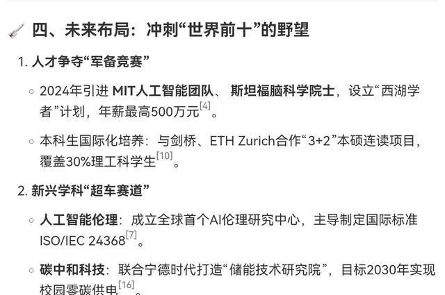 有人拍手叫好:“终于有人给中科大正名了!”也有人质疑:“浙大怎么就不配第三了?”但不要急,DeepSeek的排名可不仅仅是数字的比拼,它更注重分析每所高校的特色和短板。比如,它对清华的评价是“工科断层领先,文科与医科仍需追赶北大”;而北大的评价则是“文理医全覆盖,但工科长期被清华压制”。这种评价,虽然听着有点“扎心”,但的确客观。