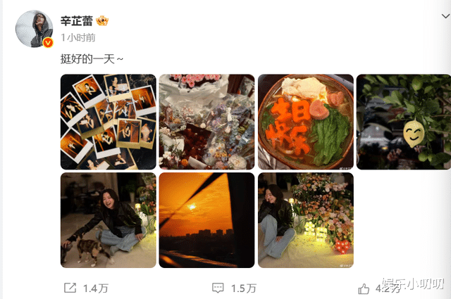 辛芷蕾的配文那是相当的言简意赅:挺好的一天!一语双关,既是自己的生日,又成为代言人。但看辛芷蕾晒出的照片,虽然很是杂乱,但却让人感受到很细节的小确幸,看得出虽然辛芷蕾大大咧咧,但也是很在乎这种生活中的小幸福。辛芷蕾晒出了粉丝送的花,还有昨天活动结束后,工作人员为其庆生的拍立得照片。