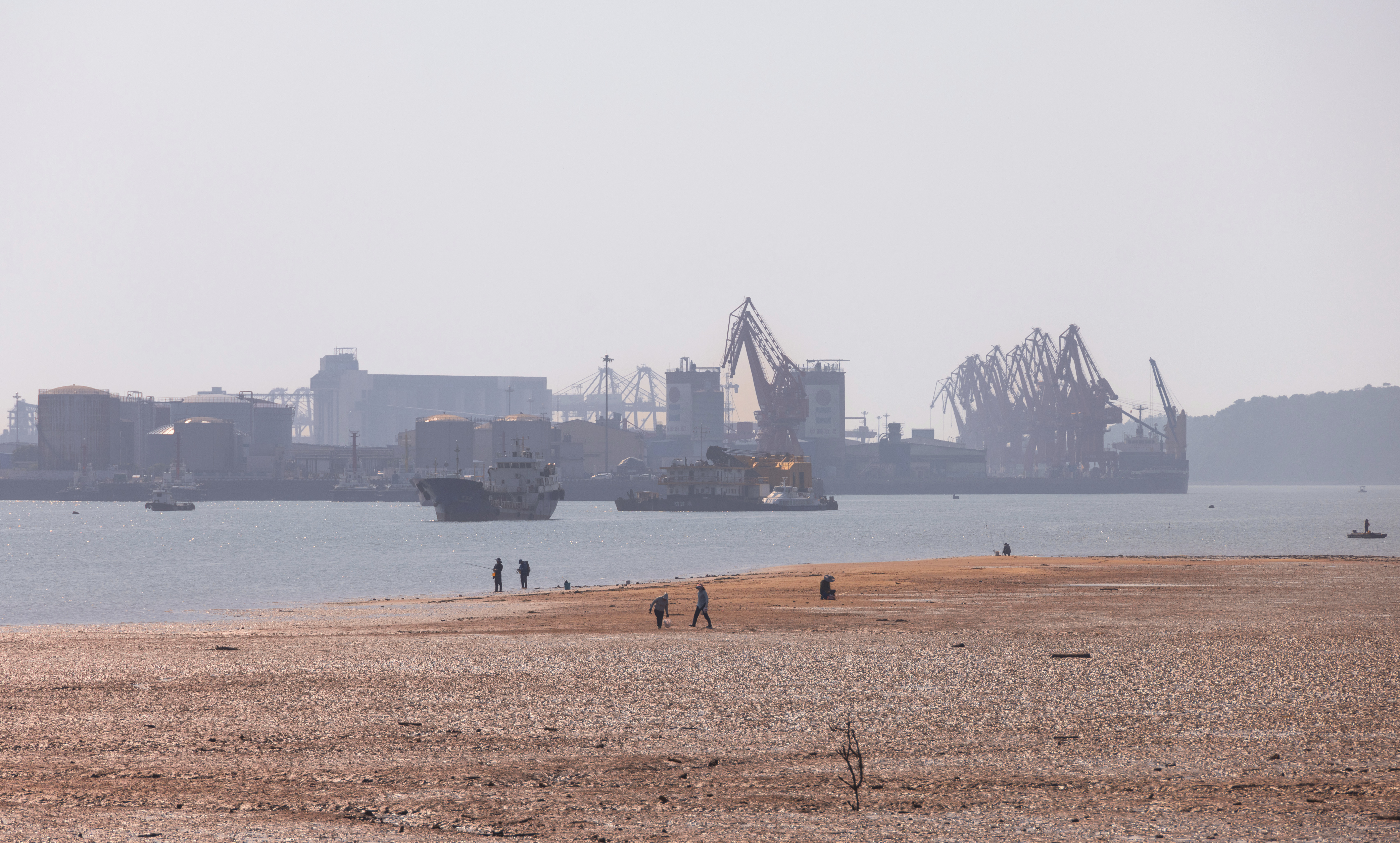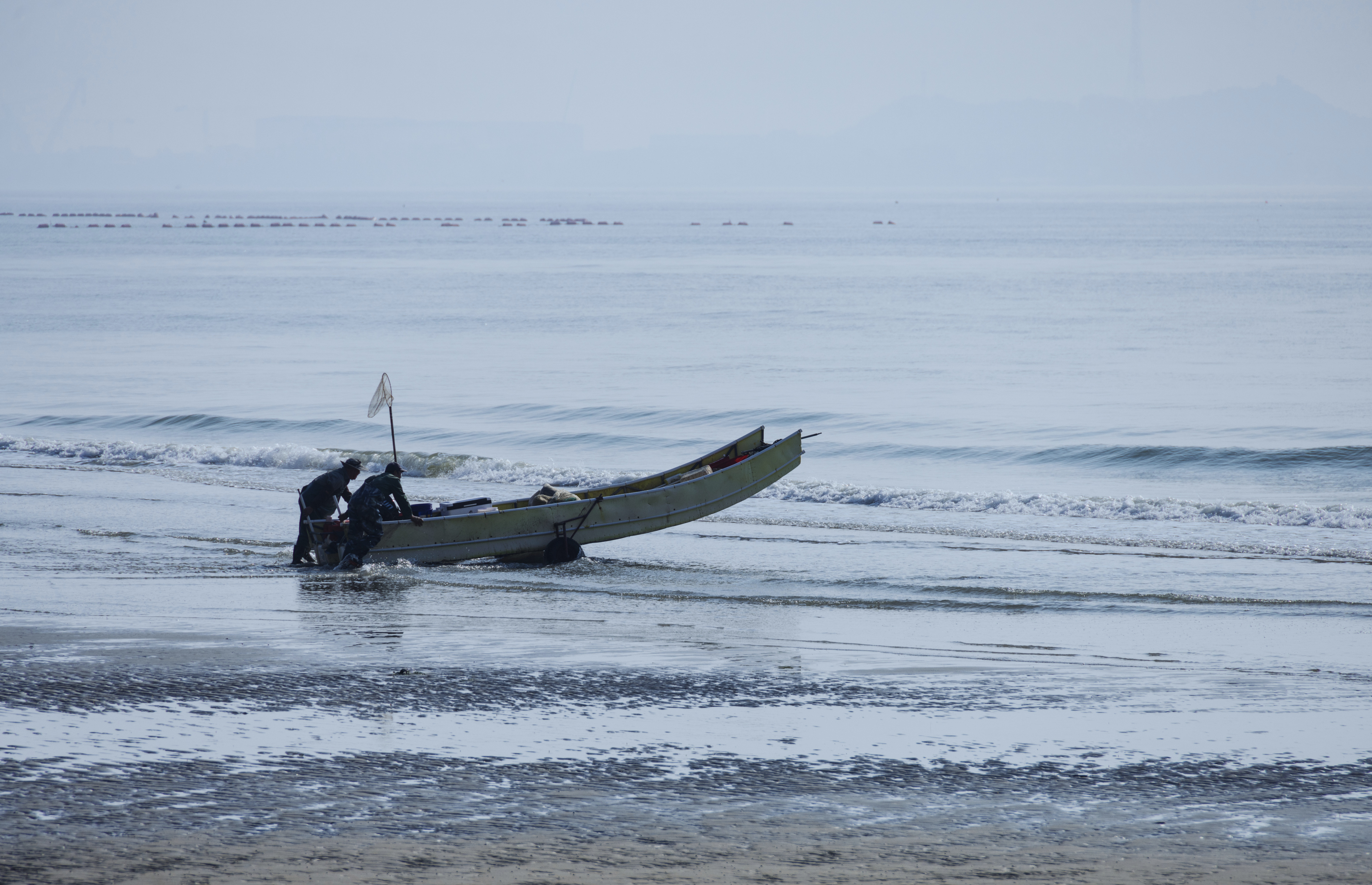 然后,我们出发前往江平镇的万尾金滩,这两地在地图上直线距离不远,沿海边公路却足有近五十公里。这里沙质偏黑,上午还是潮头较高的时候,渔船正欲启航。