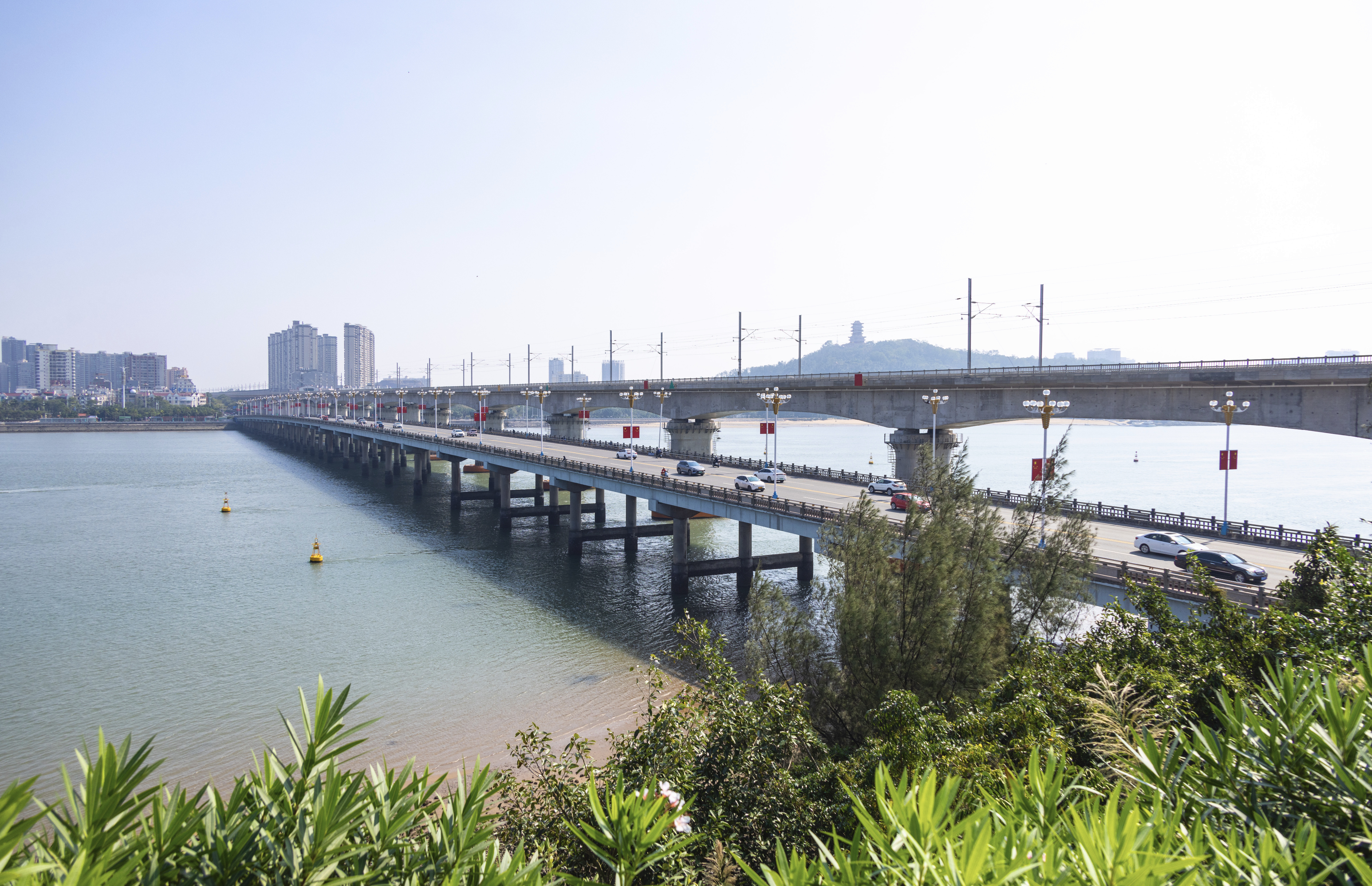 我们意欲前往白浪滩住宿,途经防城港西湾跨海大桥。大桥全长1570米,桥宽24米,东起港口区渔万岛,中跨石屋门岛和龙孔墩岛,西接防城区黄帝岭。桥梁中部设有巨大的观景平台,正是观看大桥游龙之势的佳处。