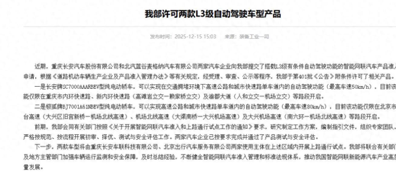12月15日,工信部官网发布了一个重磅消息:长安深蓝SL03和北汽极狐阿尔法S6这两款带L3级有条件自动驾驶功能的智能汽车,已经正式通过审批,拿到了上路行驶的“准入资格”。这就意味着,这两款车的自动驾驶功能,终于可以在指定路段合法使用了!