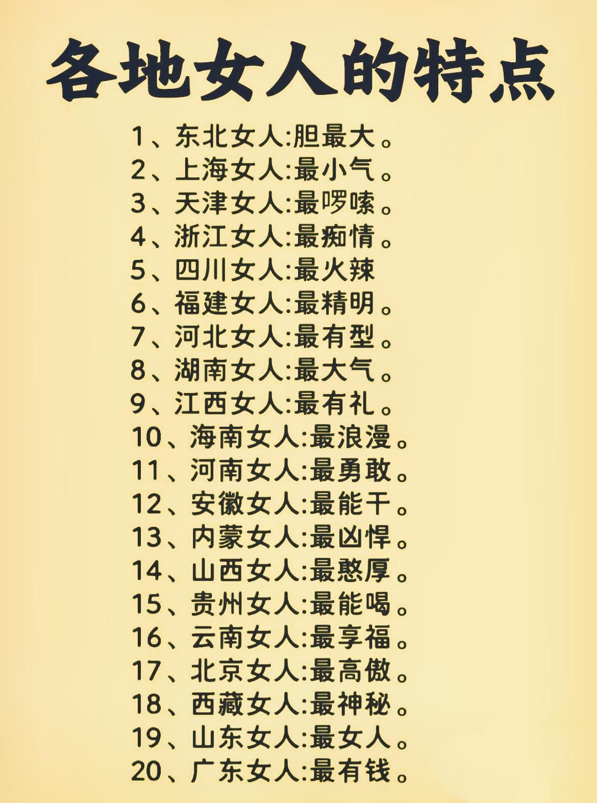 东北豪爽上海精明四川泼辣湖南大气江西知礼山东温婉广东富足西藏神秘北京傲骨云南安逸