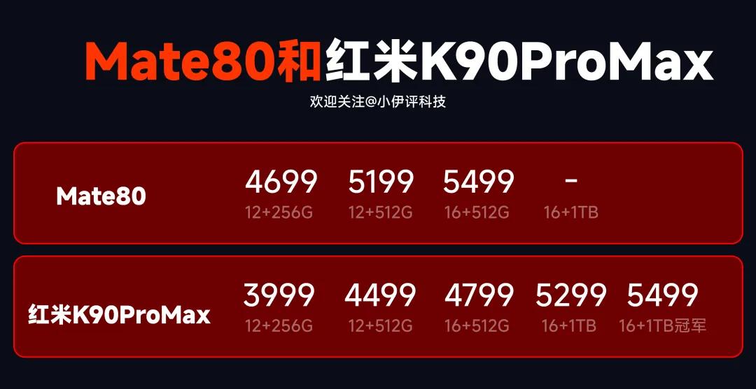 而且,更有意思的是,红米K90ProMax的顶配版(16+1TB冠军版)和华为Mate80的顶配版(16+512G)的价格是完全一致的——5499元。