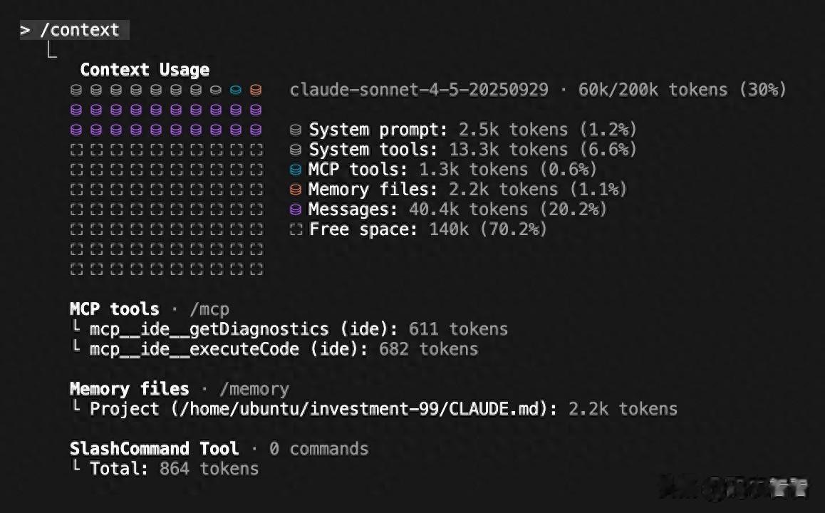 这是我近期一个副项目里 /context 的截图。可以把它理解为“空间配额”:开发一个功能时会逐步被填满。几分钟到几小时后,你需要清理消息(紫色部分),为后续工作腾出空间。