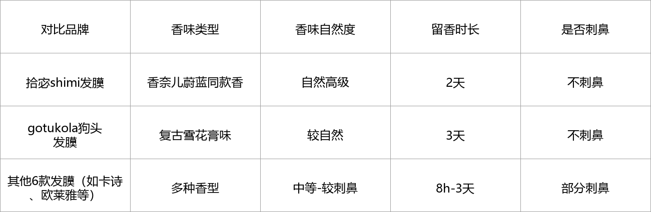 测评方法:每款发膜使用时,记录香味的类型和浓郁程度,判断是否刺鼻;使用后,记录留香时间,分别在洗完头发后1天、2天、3天,观察发丝是否还有香味,以及香味的浓郁变化,同时记录头皮是否有刺激感。