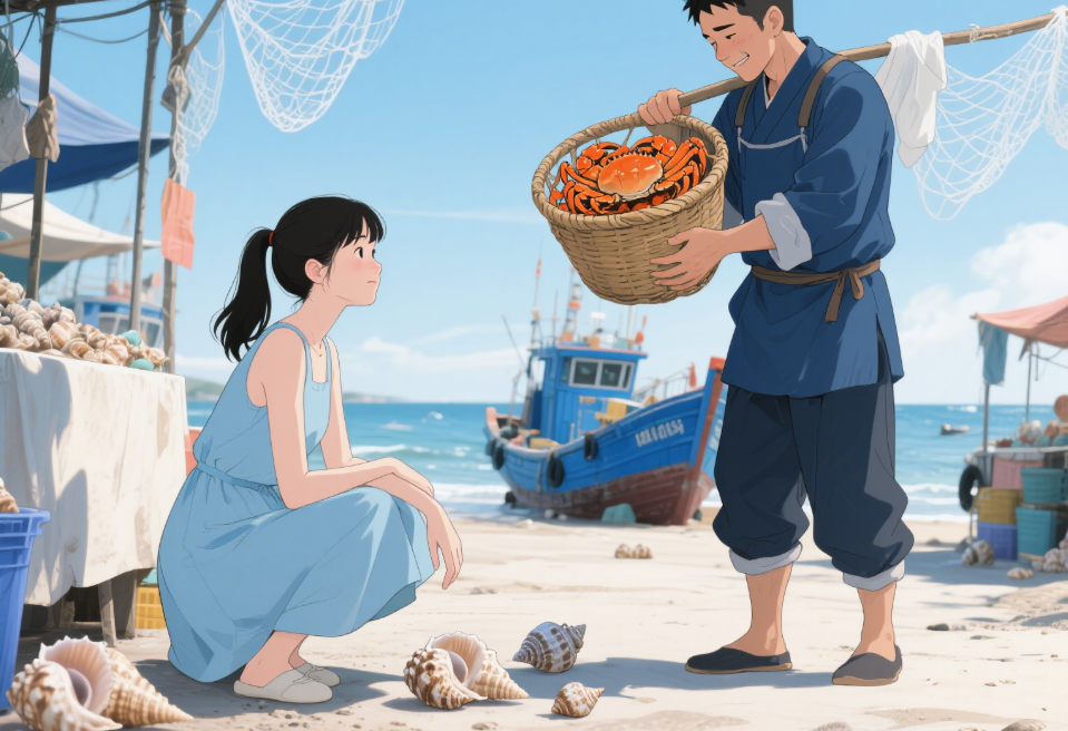 我和陈峰认识那年,我刚从城里的超市辞职回镇上。那天海边集市人多,我蹲在摊前挑海螺,他扛着一筐梭子蟹从身后过,筐沿不小心蹭到我胳膊,他立马放下筐道歉:“姑娘对不住,这蟹刚捞上来沉得很,没注意看路。” 说着就从筐里捡了只最大的塞给我,“赔你个蟹,回家蒸着吃,掀开壳满是黄。”