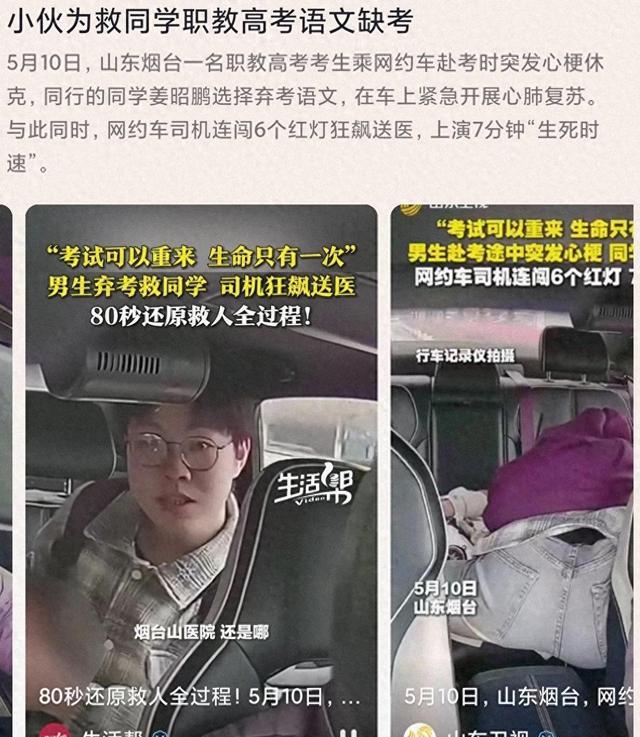 5月10日早上,在山东烟台发生了一件令人感动的事,一名考生在出租车上,成功挽救了同学的生命,虽然最终缺席了考试,但他却赢得了一张满分试卷。