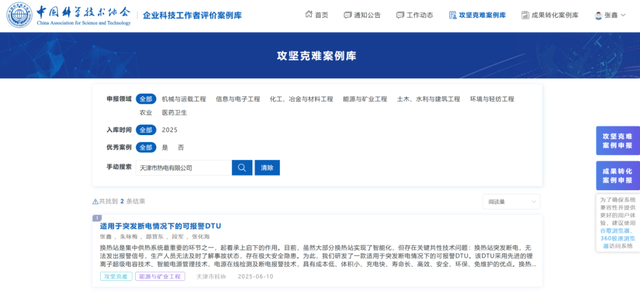 11、近日,天津能源集团热电公司自主研发的“适用于突发断电情况下的可报警DTU(数据传输单元)”案例,成功入选中国科学技术协会企业科技工作者评价案例库(攻坚克难案例库),这是热电公司在智慧供热技术领域的又一国家级成果突破。针对换热站突发断电时无法及时报警的行业痛点,公司技术团队研发的这款设备能在断电瞬间自动触发报警信号,有效消除安全隐患。