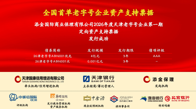 9、2月4日,由天津银行主承销的“添金国际商业保理有限公司2026年度天津老字号企业第一期定向资产支持票据”,在中国银行间债券市场成功发行。作为全国首单老字号企业资产支持票据,此次产品能够成功落地,主要得益于天津银行在债券承销市场以及资产证券化领域的丰富实践和专业优势。