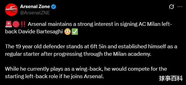 据意大利《米兰体育报》报道,阿森纳在一月转会窗开启前已对AC米兰后卫巴尔泰萨吉产生了浓厚兴趣。枪手希望这个冬天把这位边后卫带到英格兰。对枪手而言,这是一笔面向未来的精明投资,可在未来数年逐步培养。巴尔泰萨吉主打左后卫,喜欢上下翻飞,必要时参与进攻,将与卡拉菲奥里、刘易斯-斯凯利等人竞争主力位置。