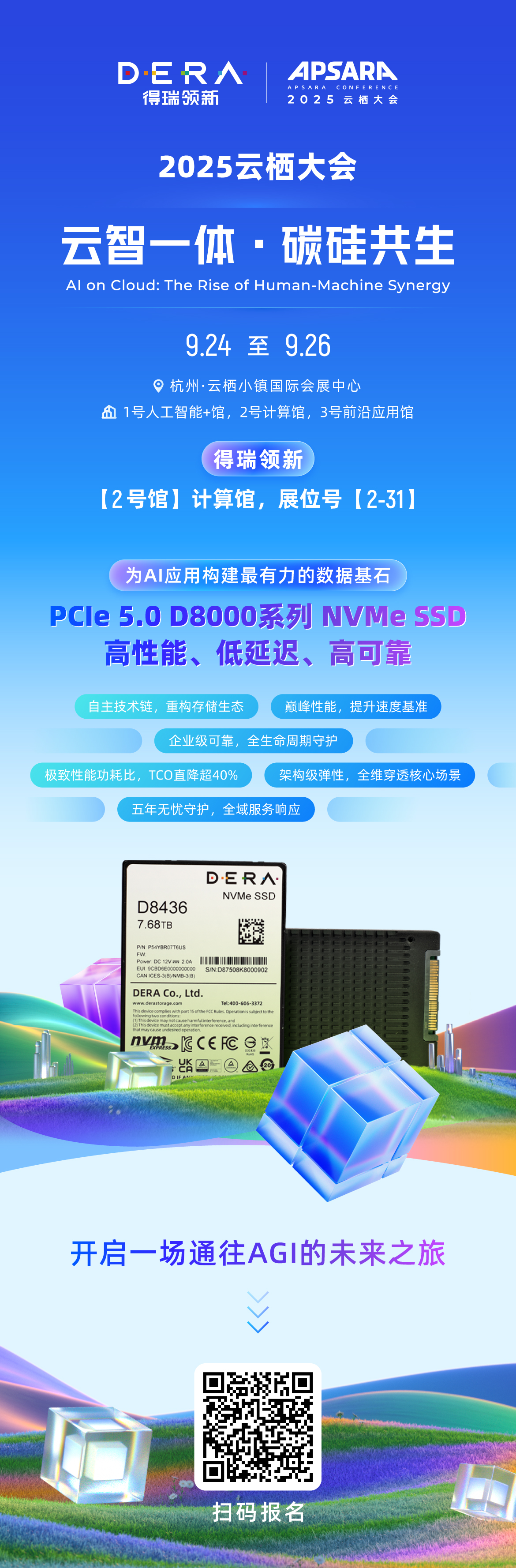 2025年9月24-26日,这场承载“预见趋势、碰撞创新”使命的盛会将再度启幕,国产企业级存储创新者北京得瑞领新科技有限公司(简称“得瑞领新”)也将与世界各地行业领袖、技术精英等共聚,展示最新明星产品PCIe 5.0企业级SSD D8000系列,以自主可控的存储技术为云计算第三次浪潮与AI产业落地注入强劲动力。