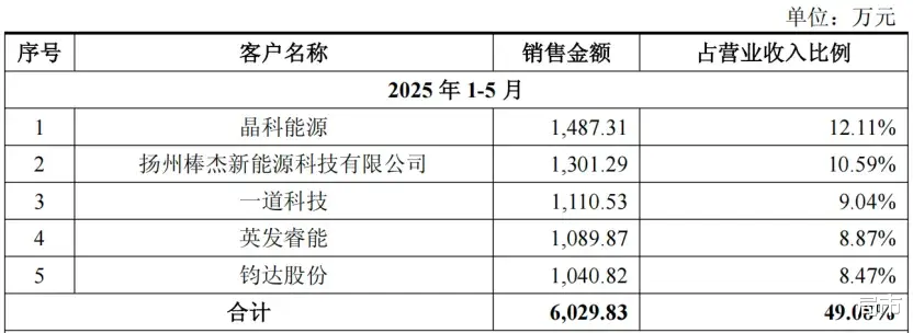 2024年,利珀科技通过向光伏企业提供机器视觉解决方案获得2.74亿元收入,占总营收比重66.7%,全球光伏组件出货量前十大厂商中九家为其客户。据披露,2025年1-5月,该公司前五大客户均为光伏企业,这五家企业提供的订单收入占总营收的49%。