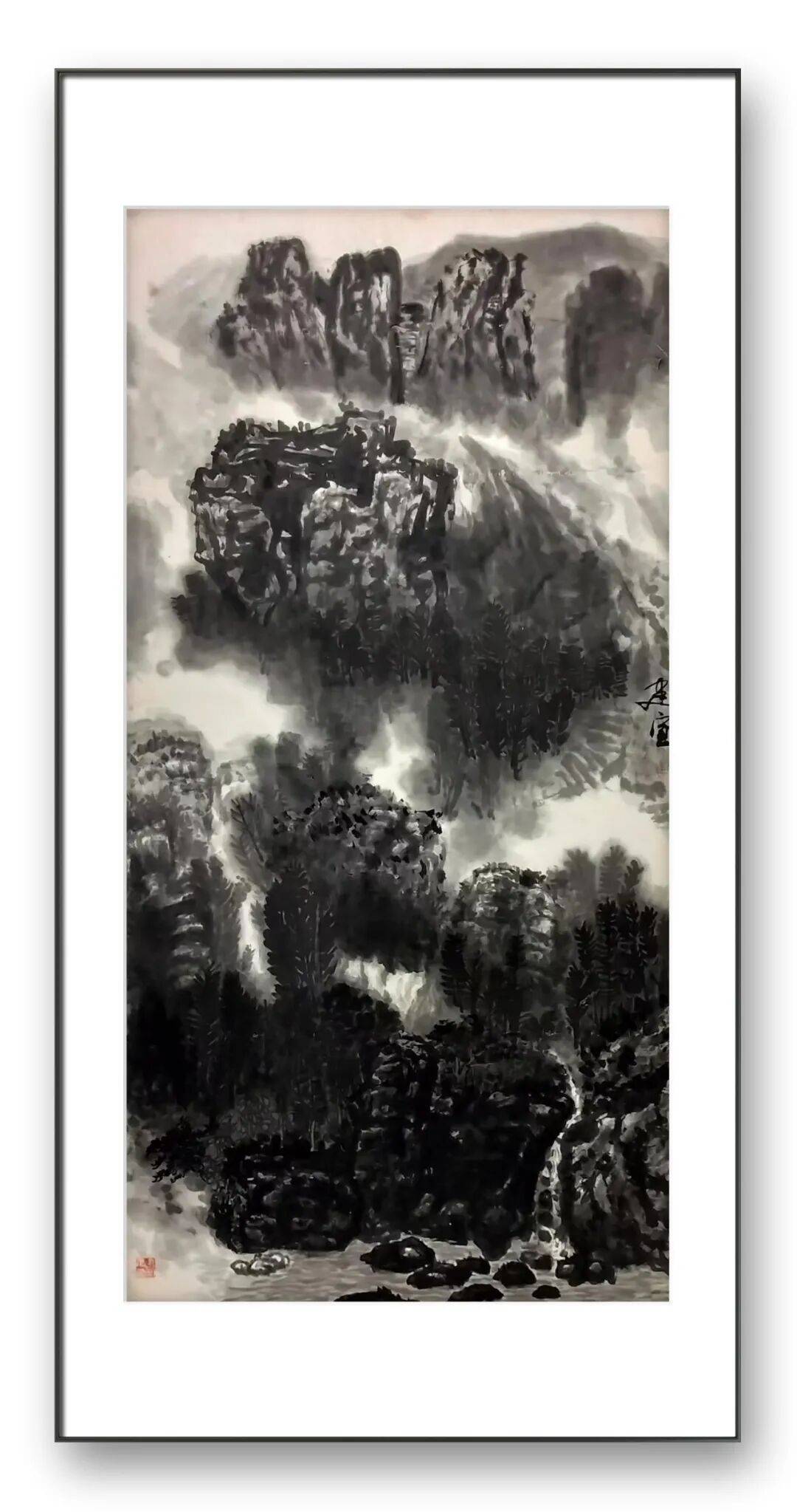 李建宣老师的山水画,首先彰显出“构图严谨,意境悠远”的艺术特质。他深谙传统山水画“高远、深远、平远”的构图之道,善于运用虚实相生、疏密得当的构图技巧,将山川、河流、林木、云雾、亭台、人物等元素巧妙组合,营造出开阔辽远、层次分明的空间感与意境美。其作品构图从不繁杂,却主次分明、错落有致,近景林木葱郁、怪石嶙峋,中景山峦叠嶂、云雾缭绕,远景峰峦隐约、天地相连,层次递进间,让观者仿佛置身于山水之间,“不下堂筵,坐穷泉壑”,感受自然山川的雄浑与灵秀。