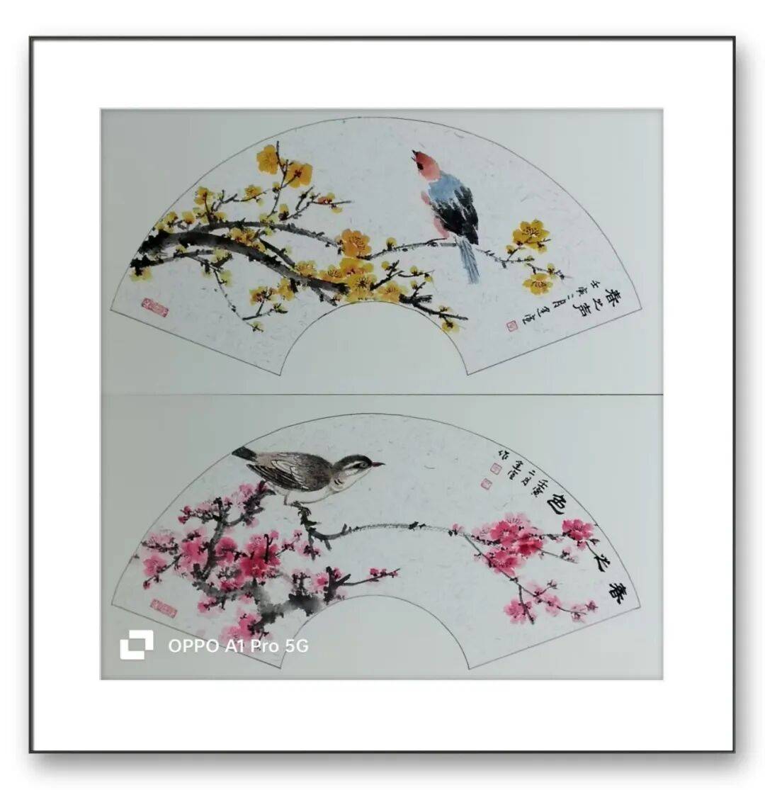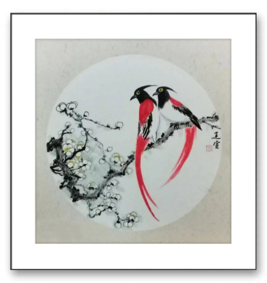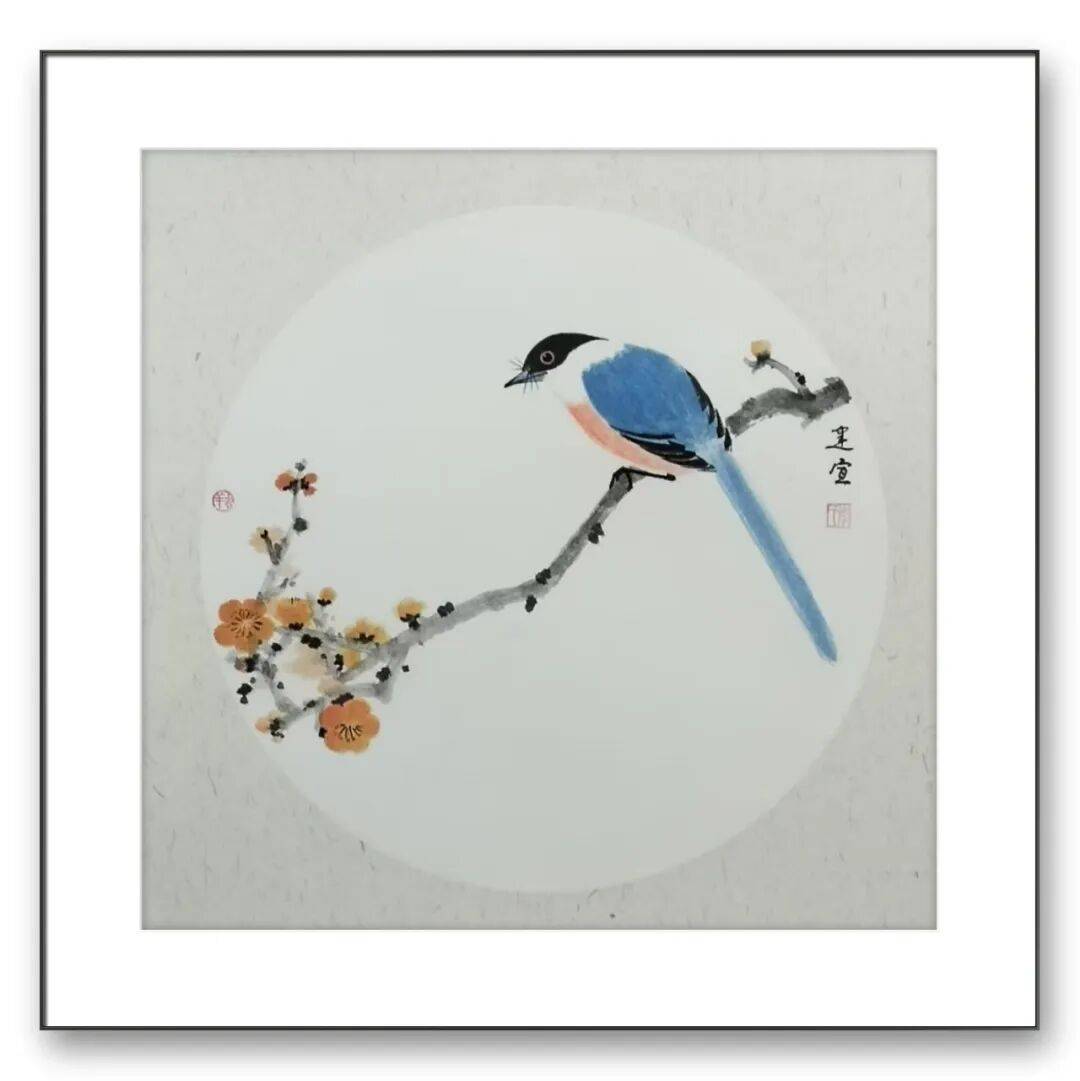 李建宣老师的花鸟画,最突出的特质便是“笔墨抒情,形神兼备”。他自幼研习传统花鸟画技法,临摹徐渭、齐白石等名家之作,汲取历代大家的笔墨精髓,却不囿于古法,而是在传承中创新,形成了兼具工写之妙的笔墨语言。其用笔灵动多变,或中锋细描,勾勒出花瓣的细腻纹理、鸟羽的轻盈蓬松;或侧锋点染,晕染出叶片的浓淡层次、枝干的苍劲质感。线条疏密得当、刚柔并济,无多余赘笔,却将花鸟的形态神韵表现得淋漓尽致——牡丹花瓣的舒展华贵、梅花傲骨的清瘦苍劲、兰草叶片的柔韧飘逸,皆在其笔下栩栩如生;麻雀的稚萌灵动、白鹭的清雅俊逸、黄鹂的活泼灵动,仿佛下一秒便会破纸而出,跃然眼前。