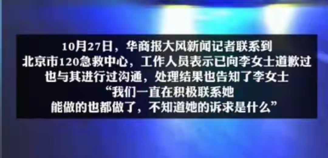10月27日,记者联系了120指挥中心,对方表示:已经和李女士道过歉了,处理结果也已经对李女士告知了,我们一直在积极沟通,该做的都做了,不知道她的诉求是什么。