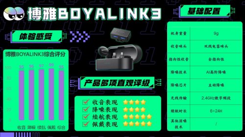 领夹麦哪个好?博雅BOYALINK3机身较轻,仅9克重,配备磁吸背夹,可轻松固定在衣物上,不影响穿着,适合新闻采访、街头随访等需要设备隐形的场景。具备AI深度降噪3.0技术,可有效压制稳定低频噪音和突发噪音,嘈杂环境下能突出人声。