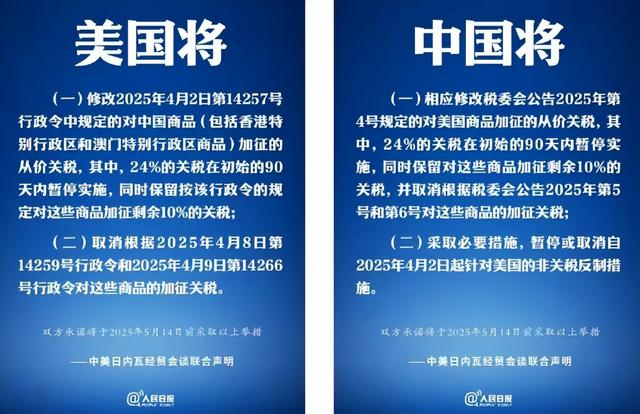 时间快进到2025年5月,中美第一轮会谈达成共识,双方把关税降到10%,算是“对等”水平。