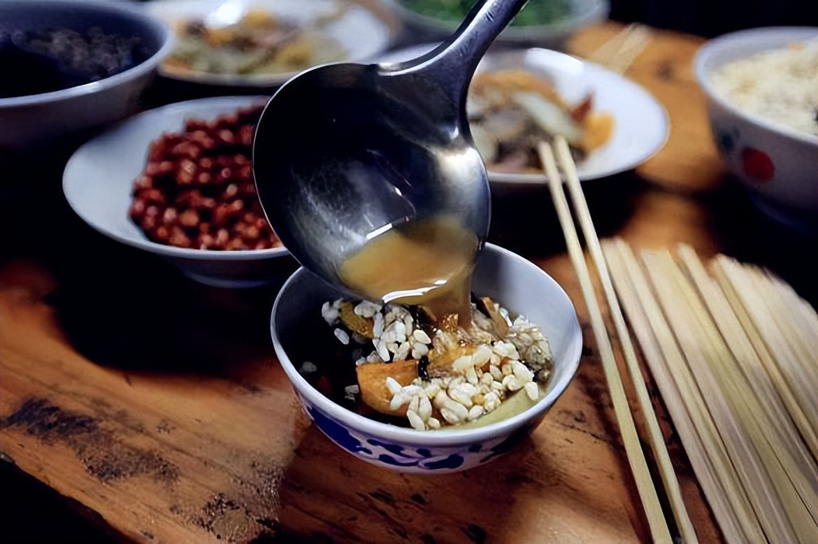 如果说酸笋的臭味是初级,那么崇左一带的酸粥简直就是“终极BOSS”。酸粥其实是发酵后的米饭浆液,当地人又称“酸糟粥”。第一次见到它的人,往往会因为那股浓烈刺鼻的发酵酸味而退避三舍,它也因此被戏称为“壮族黑暗料理”。