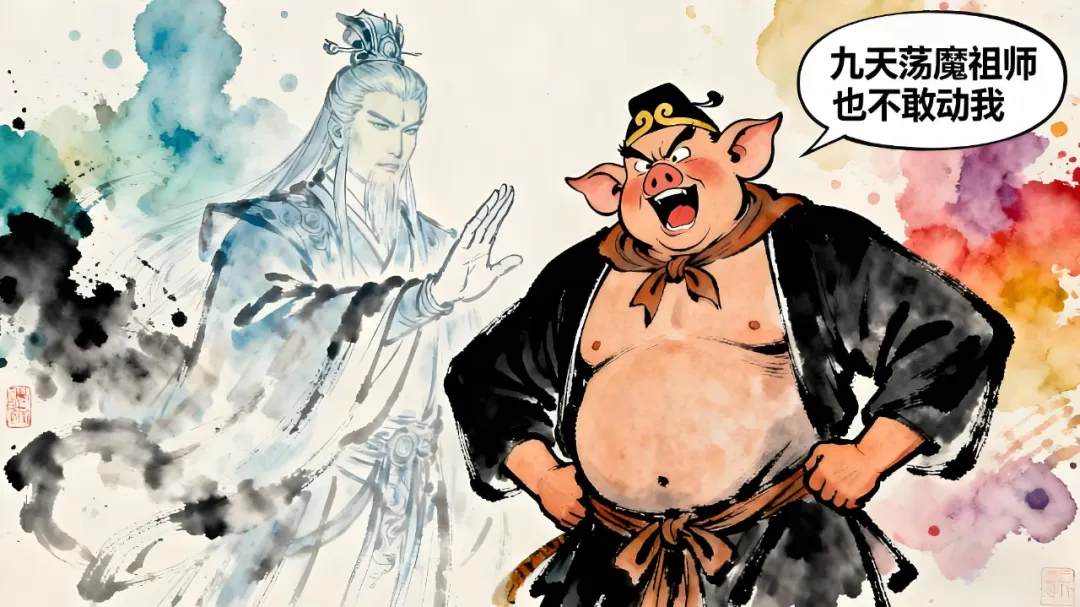 猪八戒最爱吹牛,但他的大话里,藏着破解秘密的关键破绽。在高老庄被孙悟空逼问时,他嚣张放话:“就算请下九天荡魔祖师来,也不敢动我一根手指头!”