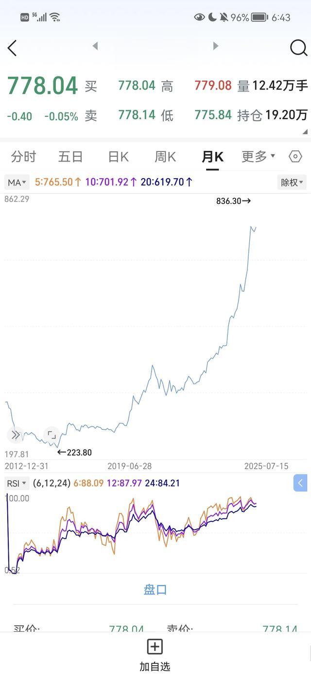 2015年,黄金每克223.8元。2025年,黄金冲到了每克836.3元。整整持仓等待了十年,终于迎来了黄金上涨了273.68%。如果按当初最低点买入的价格结算,这十年,年均收益27.36%。