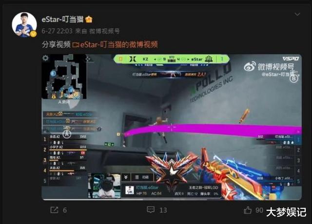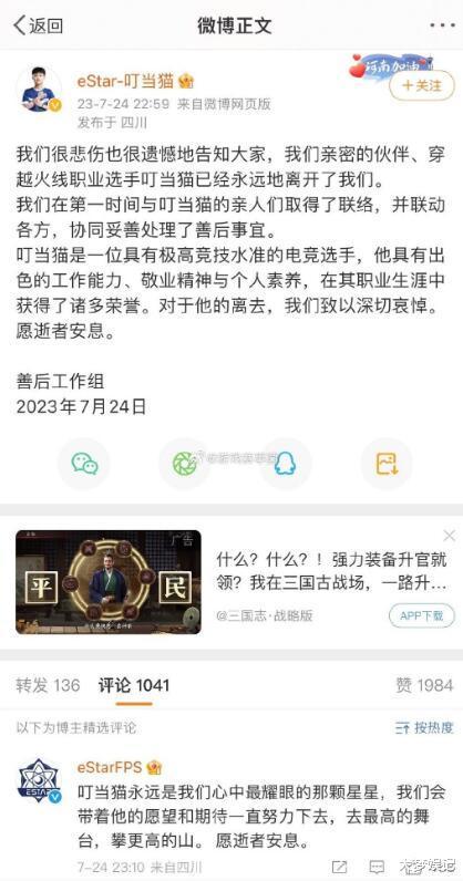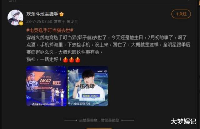 eStarFPS分部官方微博转发讣告:“叮当猫永远是我们心中最耀眼的那颗星星,我们会带着他的愿望和期待一直努力下去,去最高的舞台,攀更高的山。愿逝者安息。”