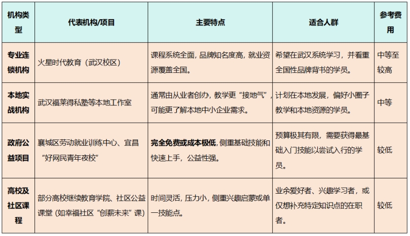 03 湖北本地培训机构对比除了跨省学习,湖北本地也有不少培训机构可供选择。这些机构各有特色,适合不同需求和预算的学员。