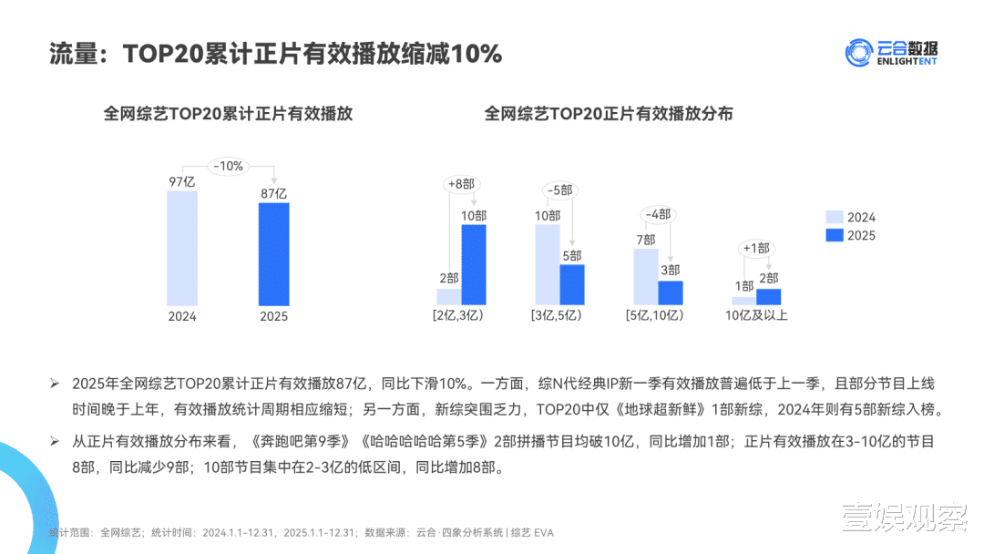 在2025年全网综艺TOP20累计正片有效播放、上新国产季播综艺数量、上新国产季播综艺独播部数占比等数据同比均有所下降之下,综艺商业化显然同样面临着更强的桎梏与更急迫的求新求变方法论。