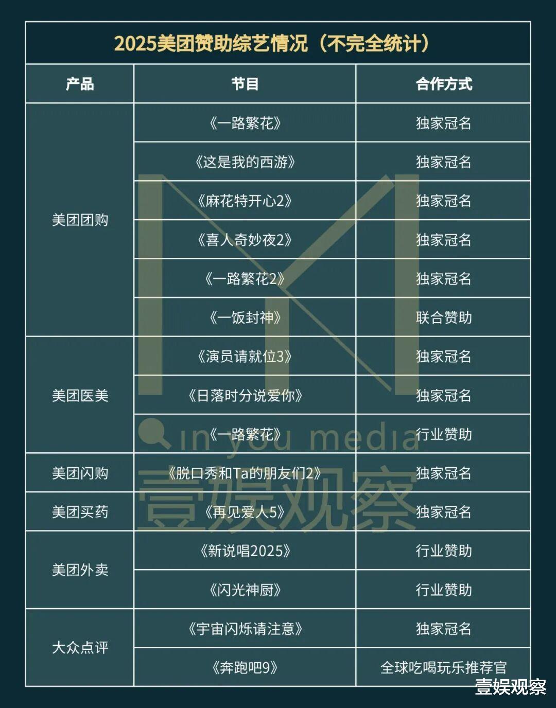 尽管2024年,美团就以6档左右的数量,且大部分集中在下半年,并有5档左右都为独家冠名,展示了自己对于综艺市场投入的趋势,但到了2025年,美团就以不同的业务线赞助了十一档左右节目,横跨多个平台内容,且以头部项目为主。