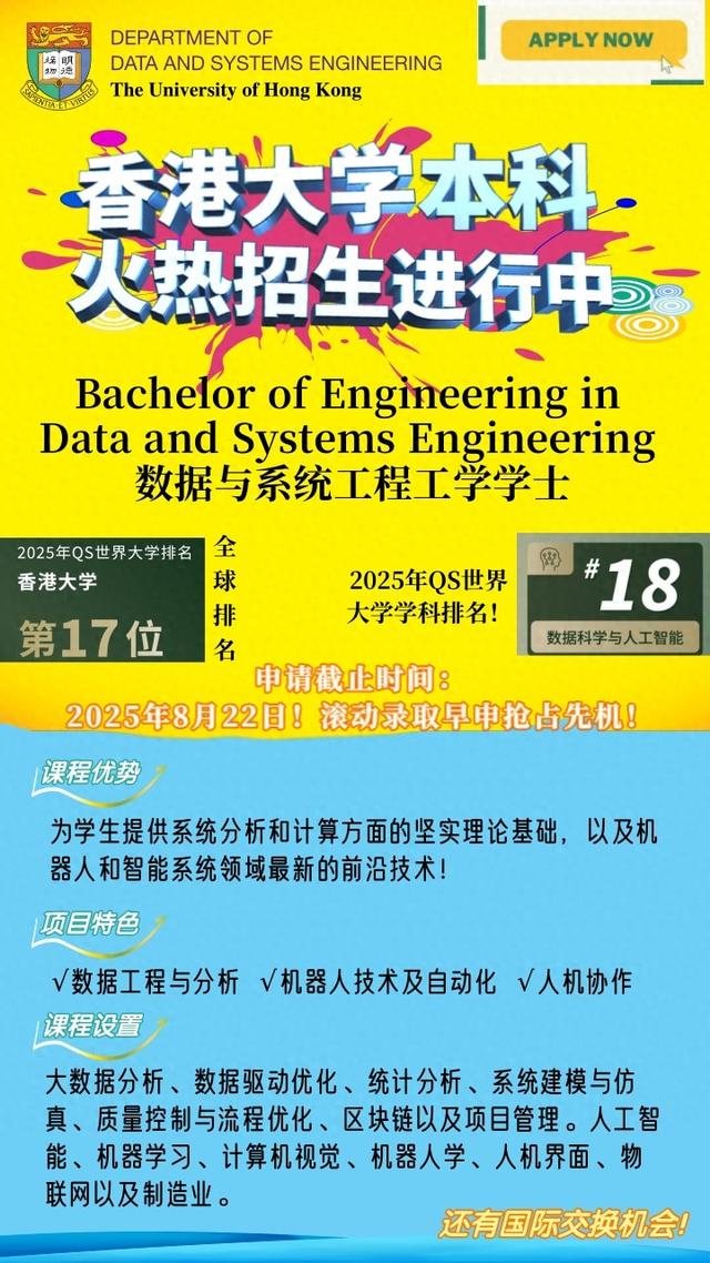 香港大学数据与系统工程专业不仅以QS全球前20的学术实力背书,更以“技术+应用”的课程设计、紧密的产学合作及全球认可的工程师资格,成为未来科技领袖的摇篮。对于志在投身人工智能、工业4.0或金融科技领域的学生,这无疑是通往顶尖职业道路的黄金跳板,招生正在进行中,感兴趣的同学们快快行动起来哦