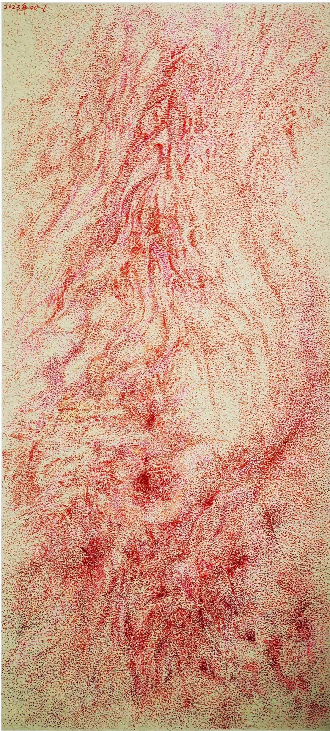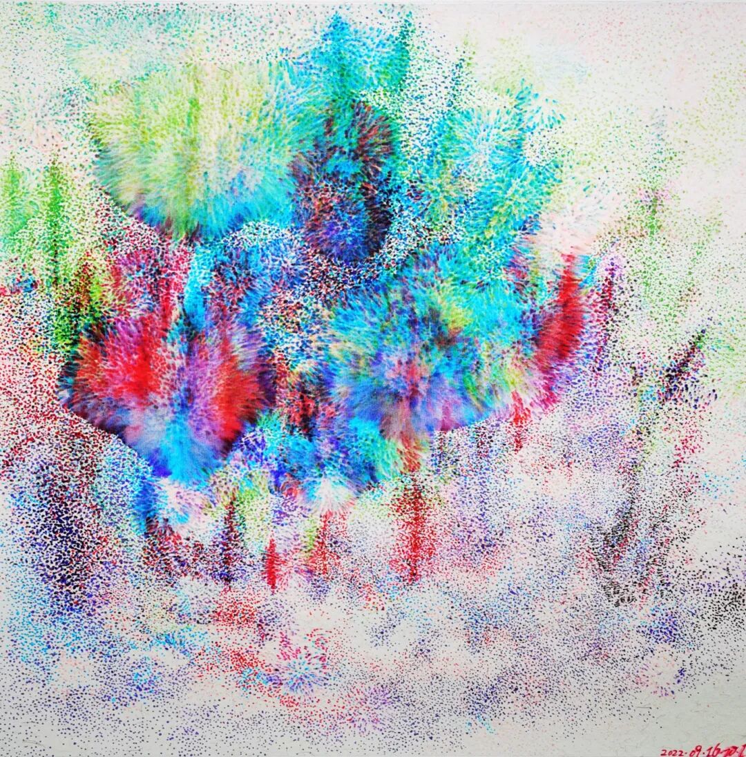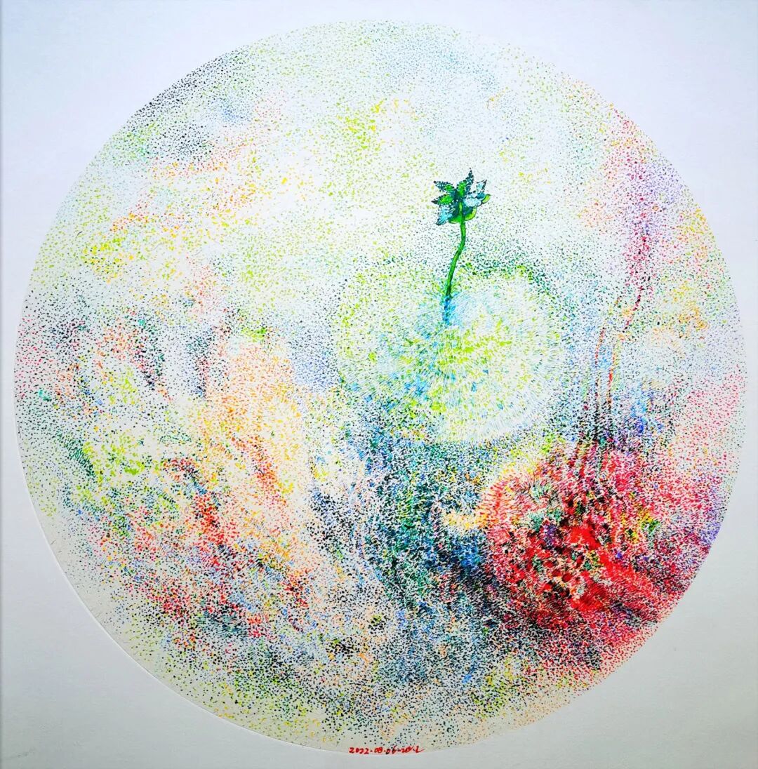 我试图通过作品,邀请观众共同探讨时间、空间与心灵的交错关系,以及我们在时间流动中的主观感知。该作品是对我个人艺术之路的回顾,更是对人类与自然、社会关系的深度思考。在当今快节奏的世界里,时间看似越发稀缺。我通过绘画的媒介,力图重构我们对时间流逝的理解。在我的作品中,时间不再是简单的线性进程,而是一种交织的、复杂具象的体验。每一笔,每一个色点,都是我对内心世界的回应,借由对自然和社会的观察,呈现出时间在不同时空中的层次变化。这些细密的色点编织出一张独特的网,帮助我们重新审视心灵与外界的联系。