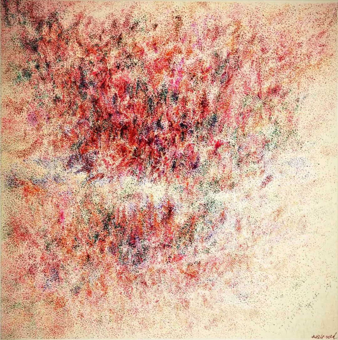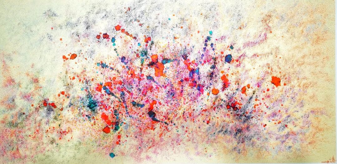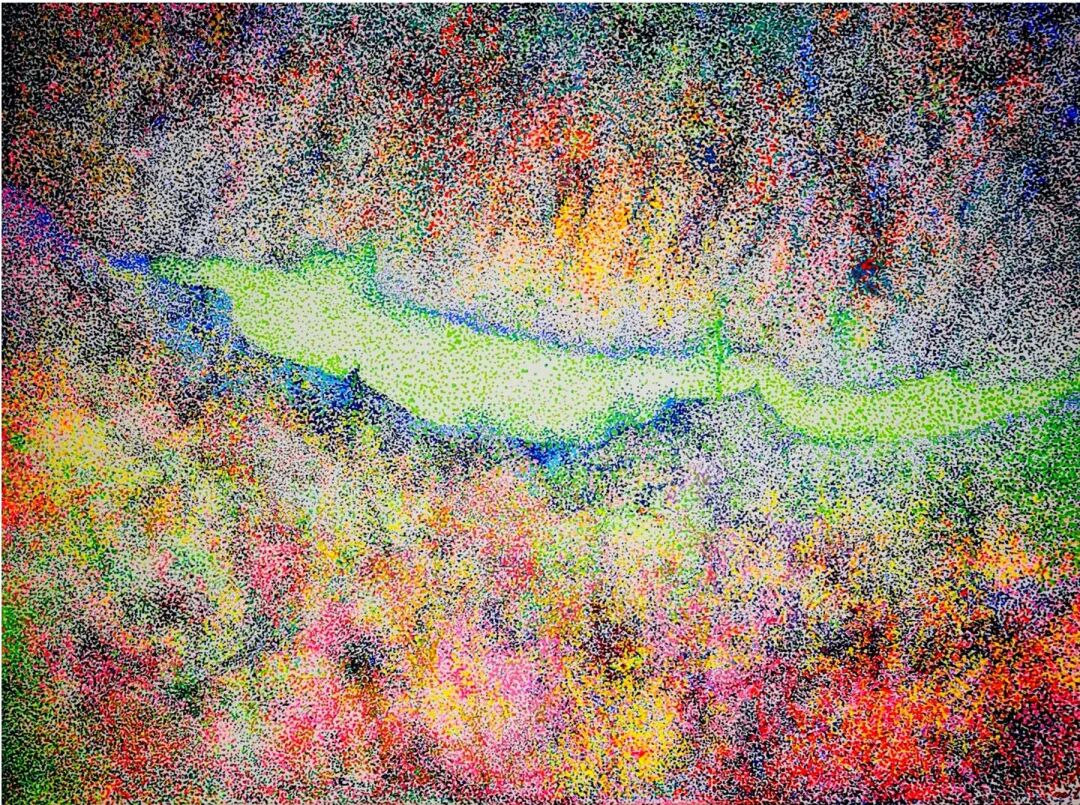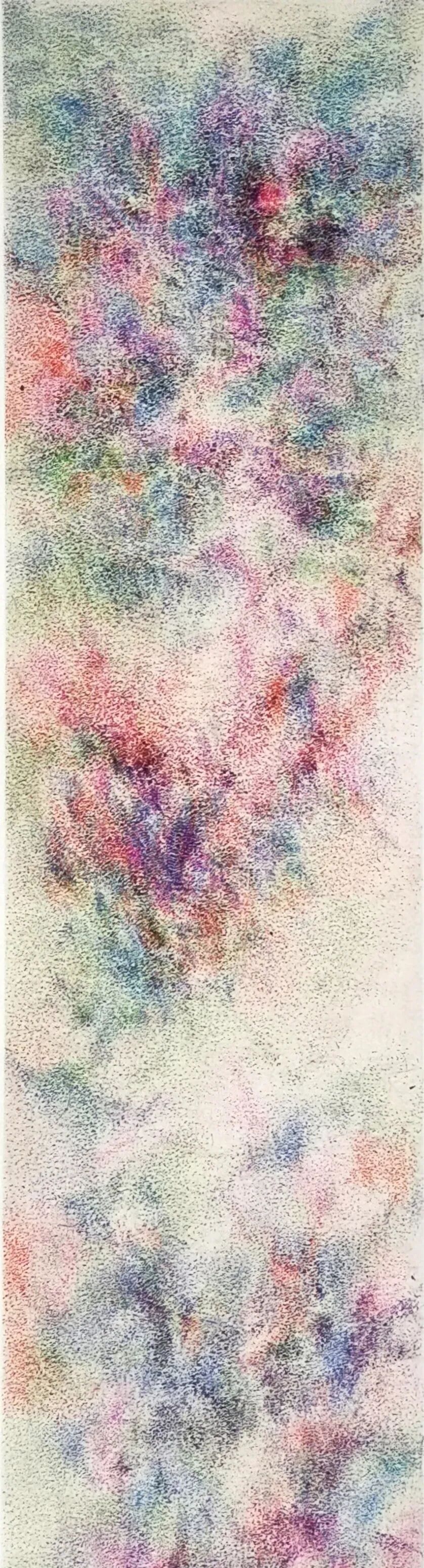 我试图通过作品,邀请观众共同探讨时间、空间与心灵的交错关系,以及我们在时间流动中的主观感知。该作品是对我个人艺术之路的回顾,更是对人类与自然、社会关系的深度思考。在当今快节奏的世界里,时间看似越发稀缺。我通过绘画的媒介,力图重构我们对时间流逝的理解。在我的作品中,时间不再是简单的线性进程,而是一种交织的、复杂具象的体验。每一笔,每一个色点,都是我对内心世界的回应,借由对自然和社会的观察,呈现出时间在不同时空中的层次变化。这些细密的色点编织出一张独特的网,帮助我们重新审视心灵与外界的联系。