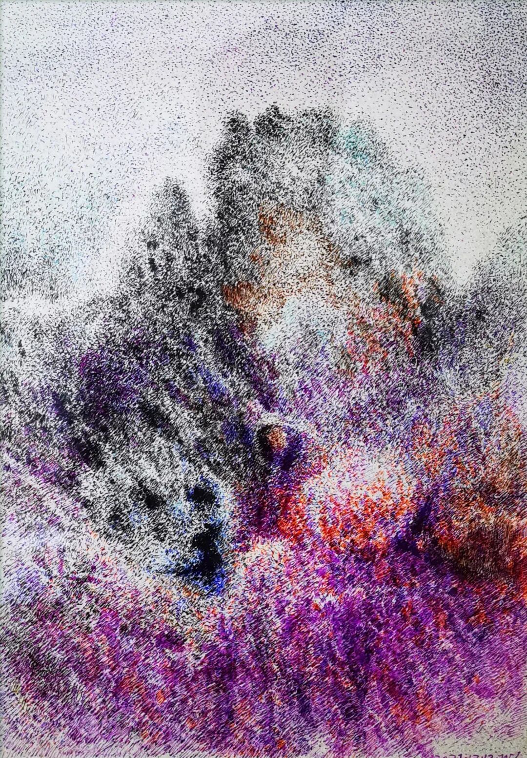 “游荡的天国”这一主题源自于我对内心与外在世界关系的持续探索。在创作中,我采用点彩技法,透过0.5毫米的针管笔进行细致表达。早期的作品更多地受到印象派对光影捕捉的影响,而后期创作逐渐向内心情感的表现转化,呈现出我与自然、社会之间那种微妙而复杂的互动关系。我的创作并非单纯的视觉表现,更是对情感与现实的交织。它们吸收了生活中的细微瞬间,反映了人与自然之间不可分割的联系。同时,我深受中国文人画的影响,追求“离形无己”的境界,力图通过艺术回归“返朴归真”的哲学理念。
