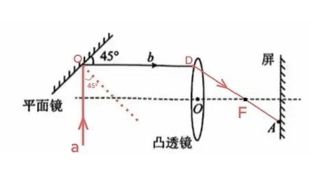 第三步:设反射光线ob与凸透镜交于D点,连接DA,则DA与凸透镜主光轴的交点为凸透镜右侧的焦点F。