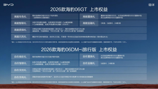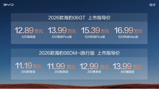 4月2日,比亚迪海洋网双车齐发——2026款海豹06GT与2026款海豹06DM-i旅行版同步上市。其中,2026款海豹06GT官方指导价为12.89-16.99万元,2026款海豹06DM-i旅行版官方指导价为11.19-13.99万元,两款新车还为用户提供涵盖购车、选装、养护等在内的多项权益,让用户真正实现无忧用车,2026款海豹06GT用户更可享受1年闪充补能权益,尽情领略全场景自由闪充的科技魅力。