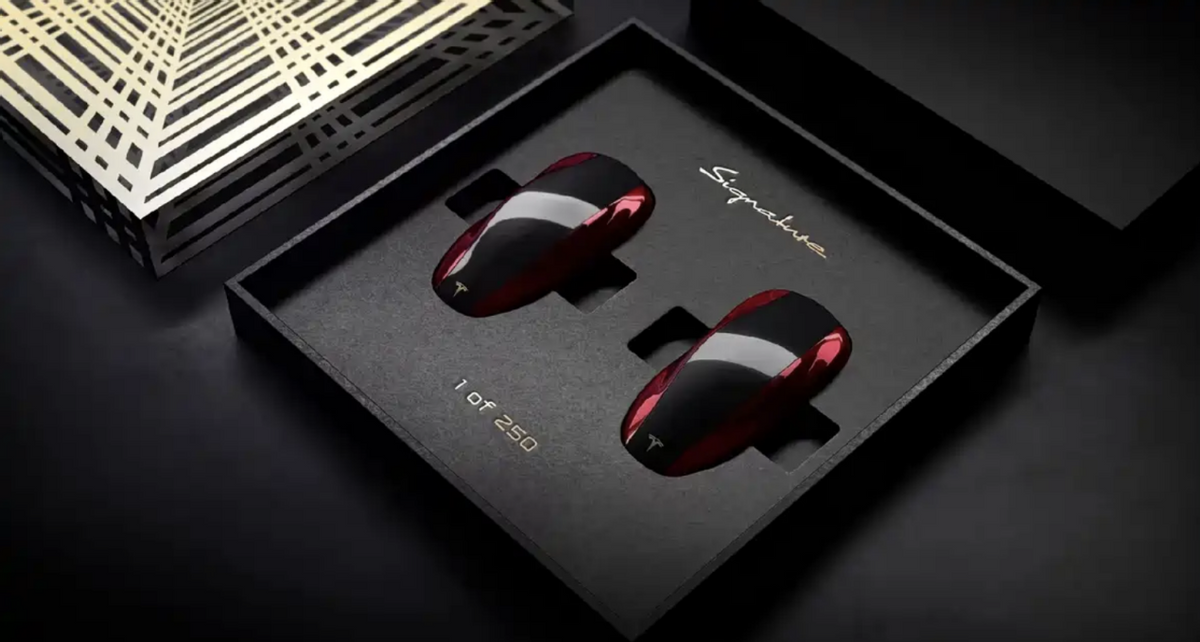我们看到,签名版新车外观采用专属石榴红车漆,致敬2012年初代Model S的发布配色,这一颜色未在任何量产特斯拉上提供。车头金色特斯拉T标、车尾金色Plaid徽章与Signature标识,处处彰显特殊身份。